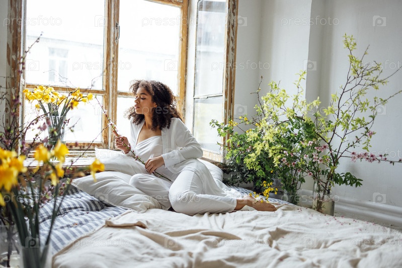 Красивая улыбающаяся афроамериканка в белом, трогающая цветущую ветку