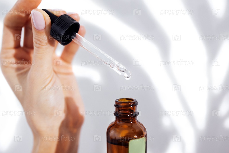 Женщина в белом халате заботится о своей коже и увлажняет лицо сывороткой