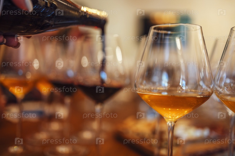Стеклянные бокалы, расставленные рядами на столе во время процедуры дегустации вин в ресторане