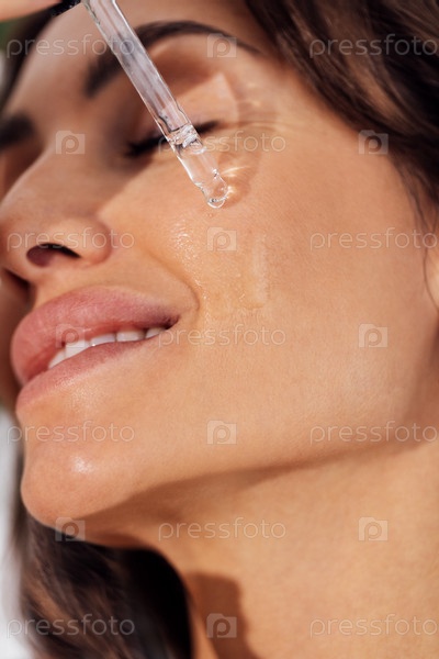 Крайний крупный план красивой улыбающейся кавказской девушки. Молодая женщина наносит на лицо прозрачную сыворотку из пипетки
