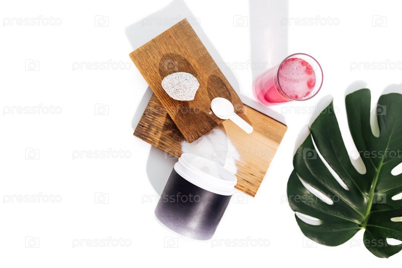 Ложка с коллагеном на деревянных подмостках, стеклянная чашка и лист монстера