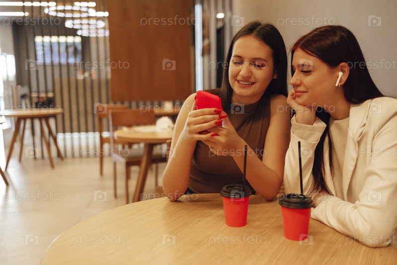Две молодые девушки сидят в кафе с современным интерьером. Улыбающиеся длинноволосые брюнетки смотрят на смартфон в ресторане
