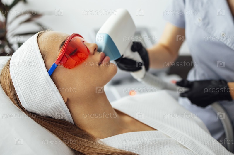 Молодая женщина получает фотоэпиляцию во время посещения салона красоты в салоне