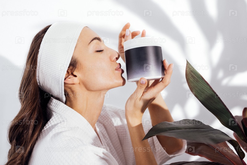 Смеющаяся женщина в белом халате заботится о своей коже и увлажняет лицо сывороткой