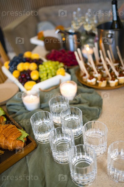 Швейцарский стол на вечеринке. Крупный план круассанов с зеленью и стаканов с напитками