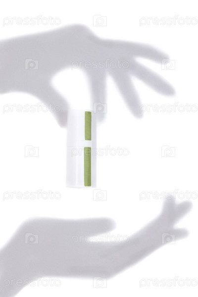 Макет белой трубки для косметики и рук, сделанных из тени на стене