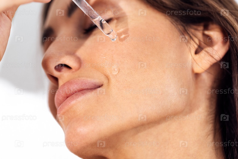 Молодая женщина наносит прозрачную сыворотку из пипетки на лицо