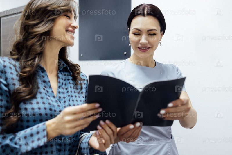 Улыбающаяся клиентка общается с женщиной-косметологом в салоне красоты