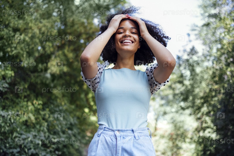 Счастливая афроамериканская девочка-подросток в повседневной одежде. Улыбающаяся темнокожая девочка-подросток, гуляющая по параллели