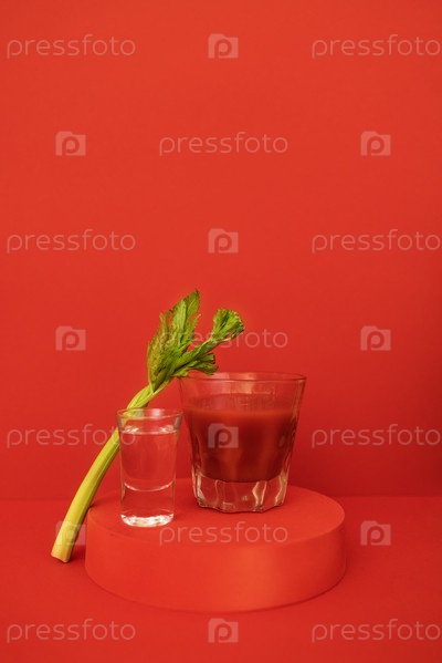 Стакан красного коктейля с зеленью на подиуме. Стильный алкогольный томатный напиток Кровавая Мэри