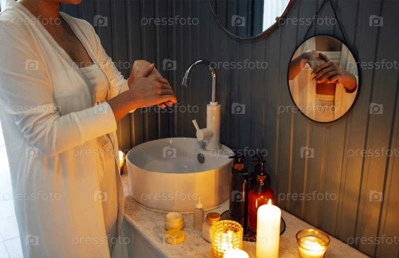 Молодая женщина с красивым вечерним макияжем мажет пальцы рук кремом