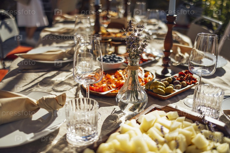 Прически и стол для гостей, украшенный свечами, сервируется столовыми приборами и посудой