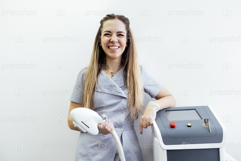 Молодая женщина в форме стоит рядом с профессиональной машиной для фотоэпиляции