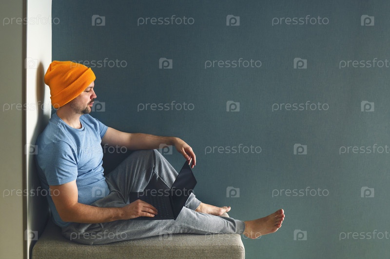 Мужчина-фрилансер в желтой шляпе, синей футболке и серых брюках работает за компьютером