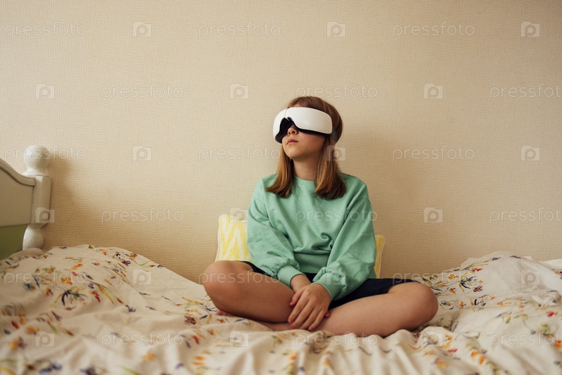 Симпатичная девочка-подросток сидит в очках виртуальной реальности на кровати в своей спальне