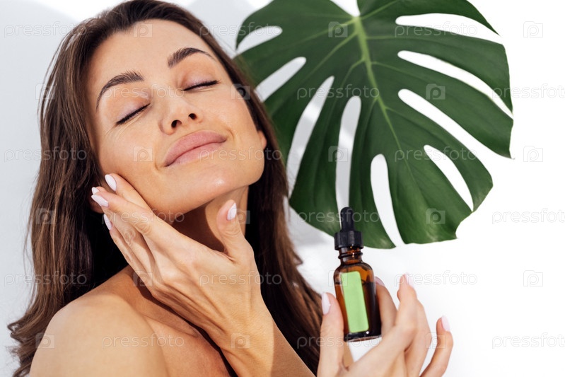 Молодая женщина наносит прозрачную сыворотку из пипетки на лицо