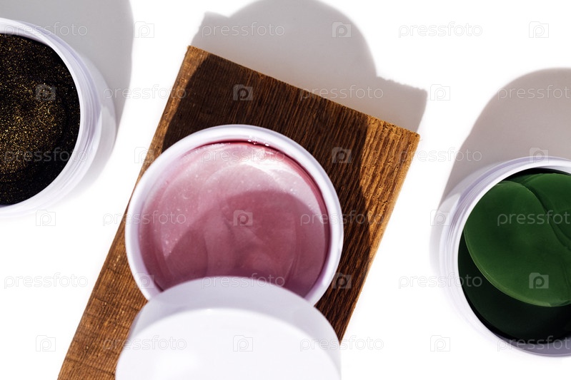 Пластиковая банка с зелеными коллагеновыми повязками для глаз на пробковом этапе. Растение алоэ, деревянная форма и коллаген