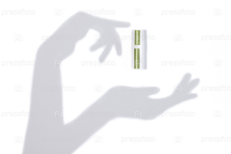 Макет белой трубки для косметики и рук, сделанных из тени на стене