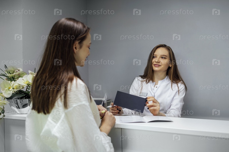 Улыбающаяся клиентка общается с женщиной на ресепшн в салоне красоты