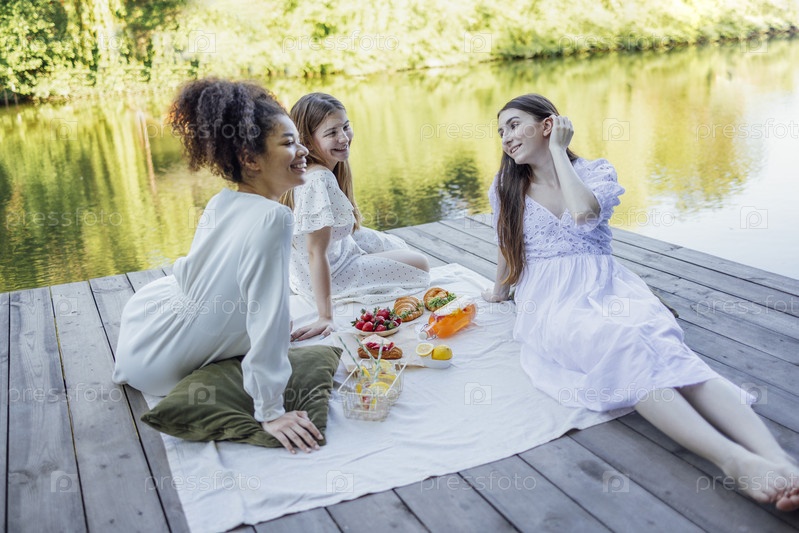 Счастливые подруги на пикнике на берегу реки