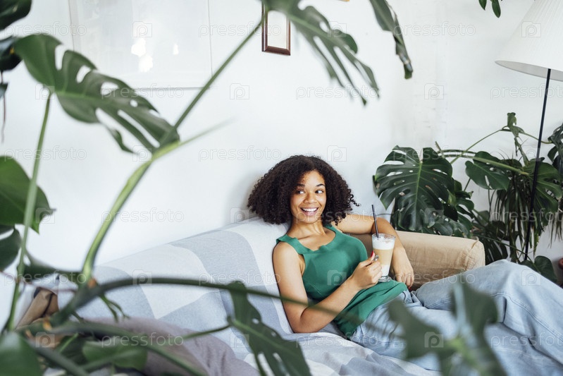 Красивая смеющаяся афроамериканка в повседневной одежде сидит на диване с чашкой латте в руках