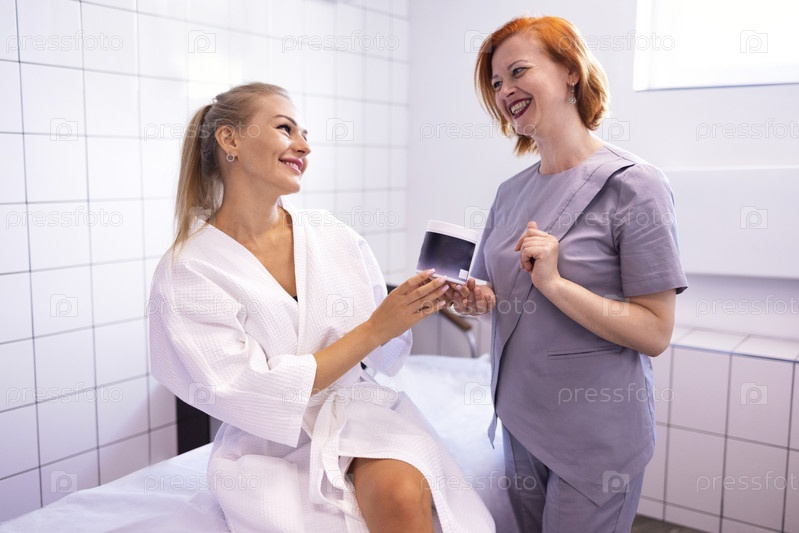 Улыбающаяся блондинка в белом халате с бумажным каталогом в руках консультируется со своим косметологом