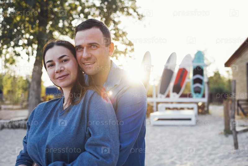 Счастливая семейная пара на пляже. Молодой человек обнимает красивую женщину на фоне досок для серфинга. Муж и жена — серферы