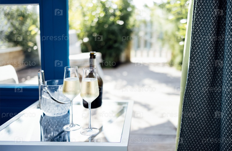 Закройте бокалы для шампанского на прозрачном столе. Бутылка вина и охладитель льда