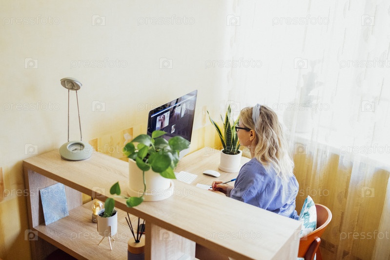 Молодая женщина сидит перед монитором компьютера и разговаривает по видеосвязи
