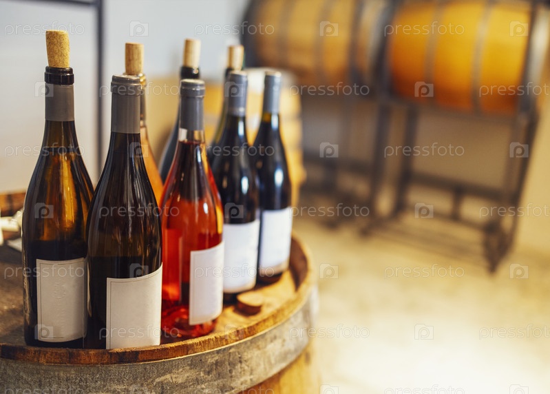 Крупный план макета группы стеклянных бутылок с разными винами и шампанским на деревянной винной бочке. Пустые белые наклейки на бутылках