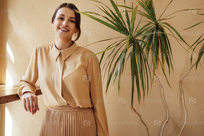 Симпатичная улыбающаяся девушка в бежевой рубашке и юбке стоит возле горшка с комнатным растением. Закройте красивый женский портрет на фоне бежевой стены и зеленых листьев