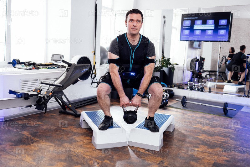 Напряженный мужчина в костюме ems стоит на ступенчатых платформах и делает приседания с гирляндами