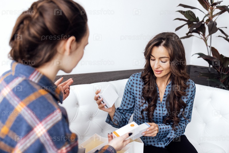 Красивая брюнетка мама выбирает косметику со своей улыбающейся дочерью-подростком