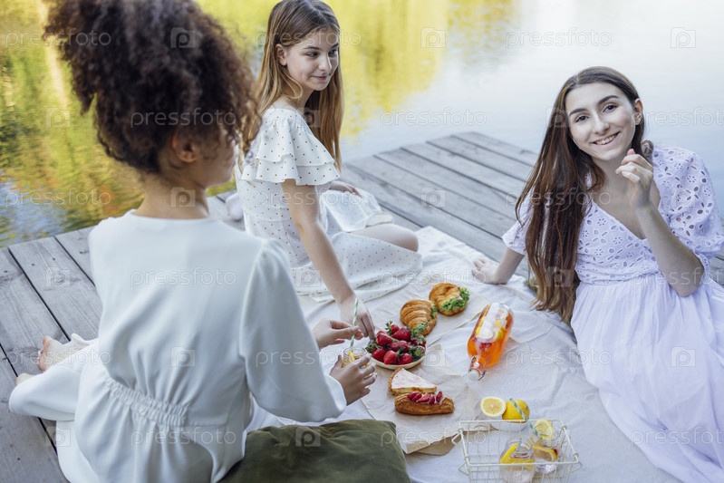 Счастливые подруги на пикнике на берегу реки