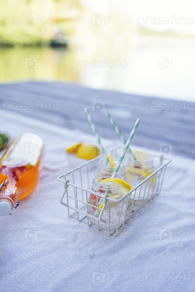 Пикник на берегу реки. Одеяло с подушками и едой на деревянном мосту