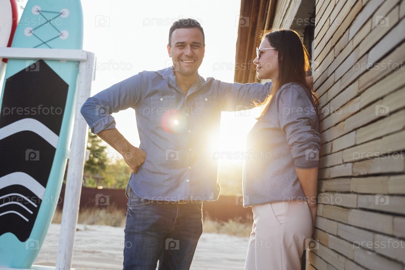 Молодой человек обнимает красивую женщину на фоне досок для серфинга
