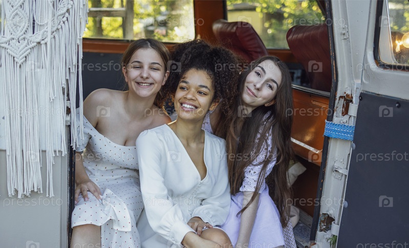 Симпатичные улыбающиеся три девочки-подростка в светлых платьях. Девушки-подростки разных национальностей сидят в ретро-микроавтобусе