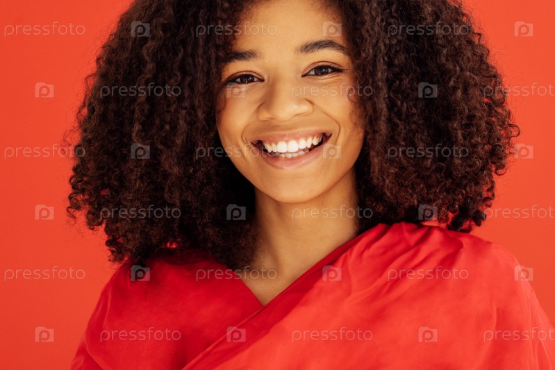 Крупный план портрета веселой красивой молодой девушки с афро-прической в красной повседневной одежде