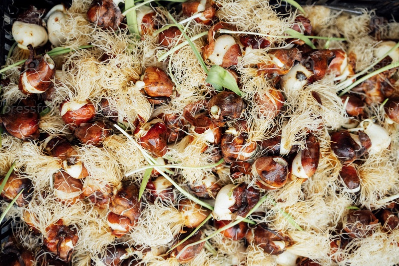 Проращивание луковиц тюльпанов. Цветочные клубни с корнями для посадки в грунт. Цветоводство. Садоводство. Скопируйте пространство