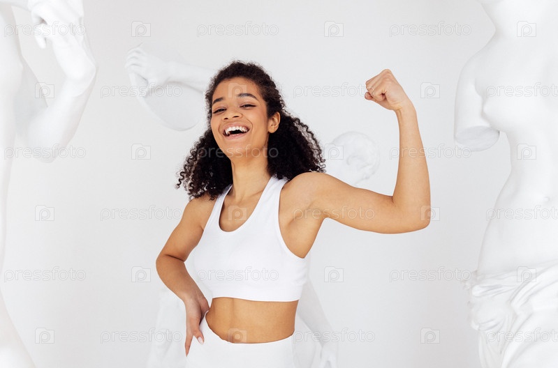 Смеющаяся счастливая кудрявая девушка смешанной расы поднимает руку и показывает бицепс