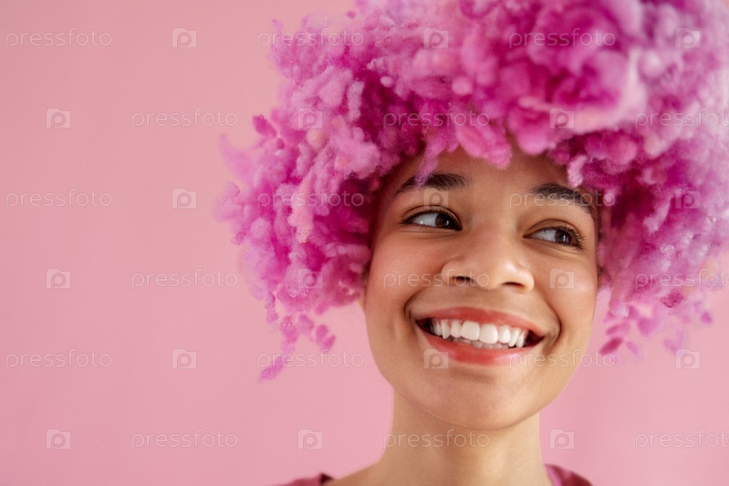 Крупным планом студийный портрет привлекательной милой веселой женщины африканского происхождения с красивой белозубой улыбкой. Симпатичная темнокожая девушка с мягким кудрявым розовым париком. Изолированная розовая пекарня. Скопируйте пространство