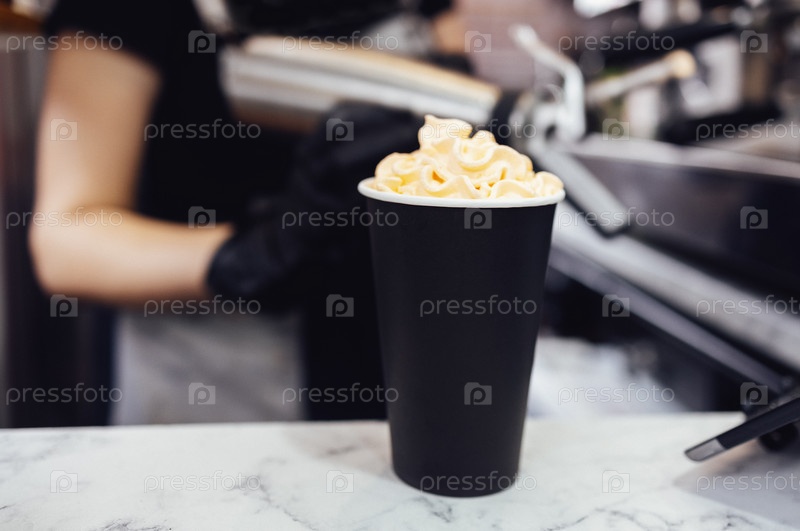 Брюнетка-бариста украшает молочный коктейль сливками с помощью кондитерской насадки