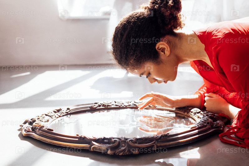 Портрет привлекательной афроамериканки, смотрящей в старое зеркало