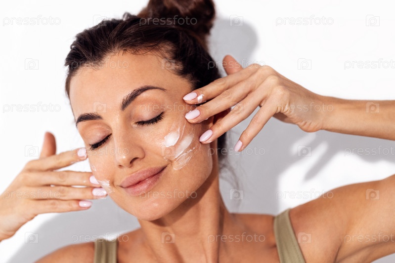 Красивая кавказская женщина мажет щеки кремом
