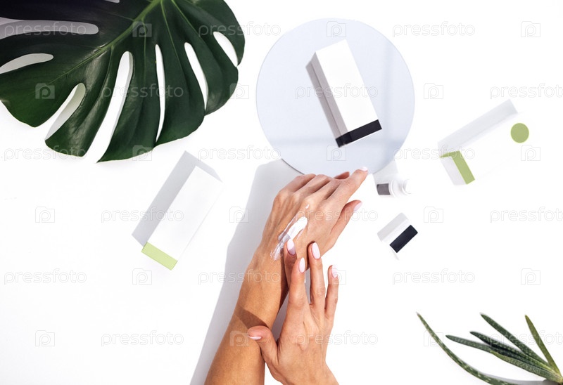 Крупный план ухоженных женских рук, наносящих на кожу смягчающий косметический крем