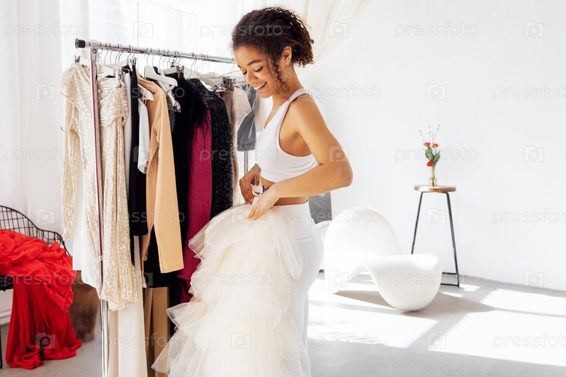 Очаровательная улыбающаяся милая африканская девушка в белом топе и leggings от trempels со стильной одеждой