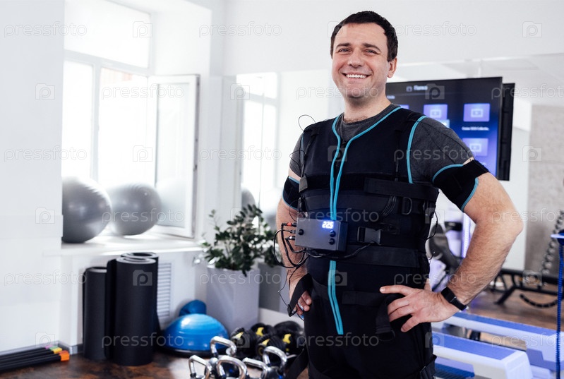 Молодой улыбающийся мужчина позирует в костюме ems в фитнес-клубе или тренажерном зале.Смехлый мужчина готовится к тренировке по электрической стимуляции мышц