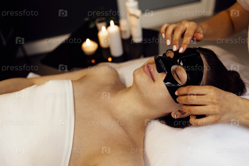 Красивая брюнетка с косметической маской на лице. Уход за кожей с