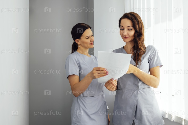 Красивая улыбающаяся женщина-врач в медицинской форме стоит у окна в клинике