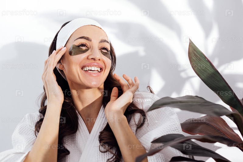 Улыбающаяся женщина в белом халате заботится о своей коже и наклеивает на лицо черные пятна. Красивая девушка, использующая средства по уходу за кожей от темных кругов